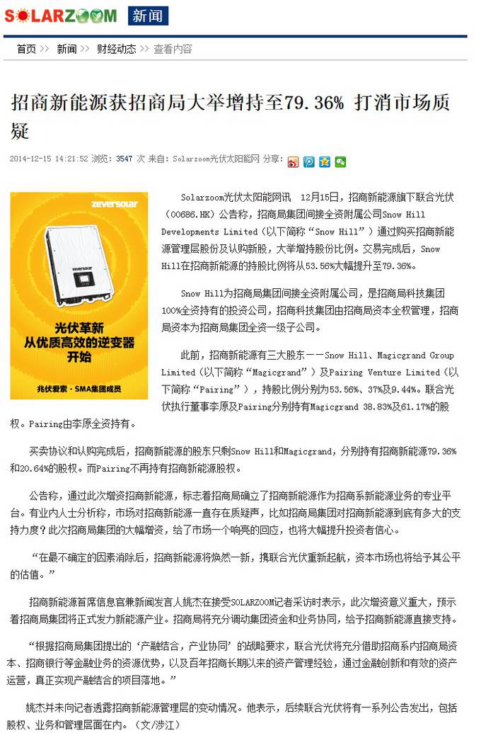 Solarzoom光伏太阳能网讯 12月15日,招商新能源旗下联合光伏(00686.HK)公告称,招商局集团间接全资附属公司Snow Hill Developments Limited(以下简称“Snow Hill”)通过购买招商新能源管理层股份及认购新股,大举增持股份比例。交易完成后,Snow Hill在招商新能源的持股比例将从53.56%大幅提升至79.36%。