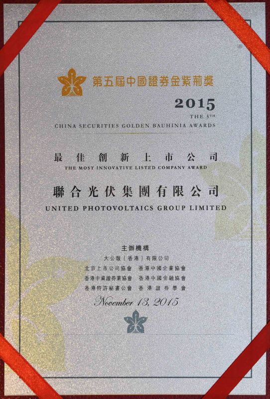 中国香港,2015年11月16日 – 联合中国证券金紫荆颁奖典礼在香港举行,联合光伏集团有限公司(“联合光伏” 或 “本集团”,股份代号:00686.HK,第一大股东为招商新能源集团有限公司“招商新能源”)凭借在产融模式创新、先进技术创新以及经营业绩等方面的优异表现获得“最佳创新上市公司奖”。
