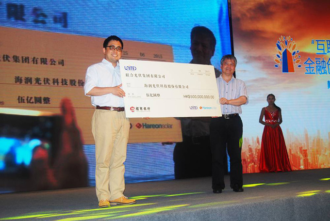 中国上海,2015年6月25日 – 中国专注光伏电站的投资和运营商联合光伏集团有限公司(“联合光伏” 或 “本公司”,股份代号:00686.HK,联合光伏的第一大股东为招商新能源集团有限公司“招商新能源”)与海润光伏科技股份有限公司(“海润光伏”)于6月8日启动了全球最大单笔太阳能电站收购的交付。联合光伏今天(6月25日)根据协议,向海润光伏支付了港币5亿元的第三笔预付款。在此之前,联合光伏与海润光伏就此收购已达成一致,将以人民币88亿元的价格收购海润光伏位于中国大陆17个地区的项目,总装机容量为930兆瓦。作为中国领先的清洁能源供应商,联合光伏与海润光伏的牵手标志着中国光伏产业链的上下游生态合作更趋完善。