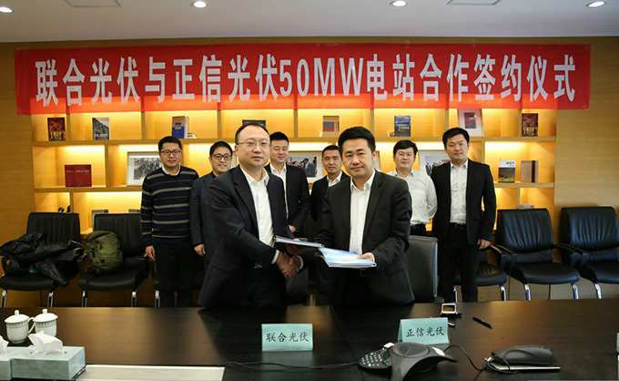 中国香港,2015年1月16日 – 联合光伏集团有限公司(“联合光伏” 或 “本公司”,股份代号:00686.HK,第一大股东为招商新能源集团有限公司“招商新能源”),中国领先的光伏电站投资和运营商,今天欣然宣布本公司下属子公司联合光伏(常州)投资有限公司在深圳招商局资本总部与正信光伏有限公司(“正信光伏”)签订股权转让协议,联合光伏首席财务官李宏、正信光伏首席执行官王迎春分别代表双方签字。招商局资本董事总经理、本公司执行董事卢振威、本公司首席执行官李原以及PGO合作组织会长、国网南瑞电力设计有限公司总经理俞胜出席并见证本次签约仪式,招商局集团副总经理、招商资本首席执行官李引泉在签约仪式后会见了全体代表。