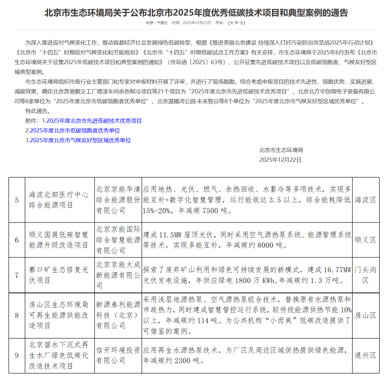 Recently, the Beijing Municipal Ecology and Environment Bureau unveiled the list of Beijing’s 2025 Outstanding Low-Carbon Technology Projects and Typical Cases. Beijing Energy International’s low-carbon intelligent energy retrofit project at the China International Exhibition Center (Shunyi) was successfully selected as a “2025 Beijing Advanced Low-Carbon Technology Outstanding Project.” Leveraging cutting-edge technology integration and significant results in energy conservation and carbon reduction, the project stood out among its peers, underscoring the company’s continued leadership and demonstrative role in the field of low-carbon technologies.
